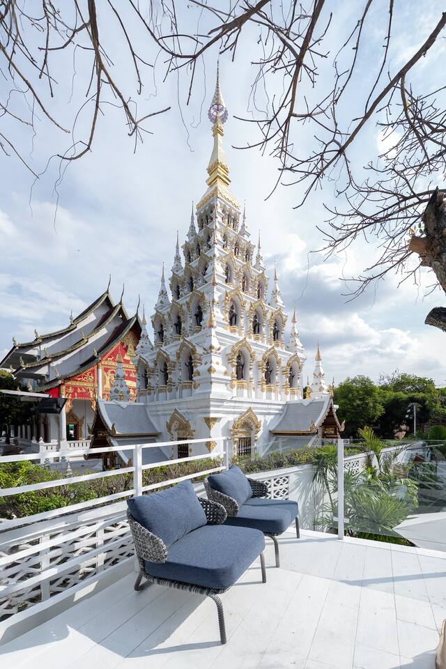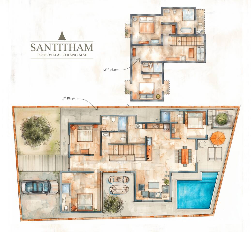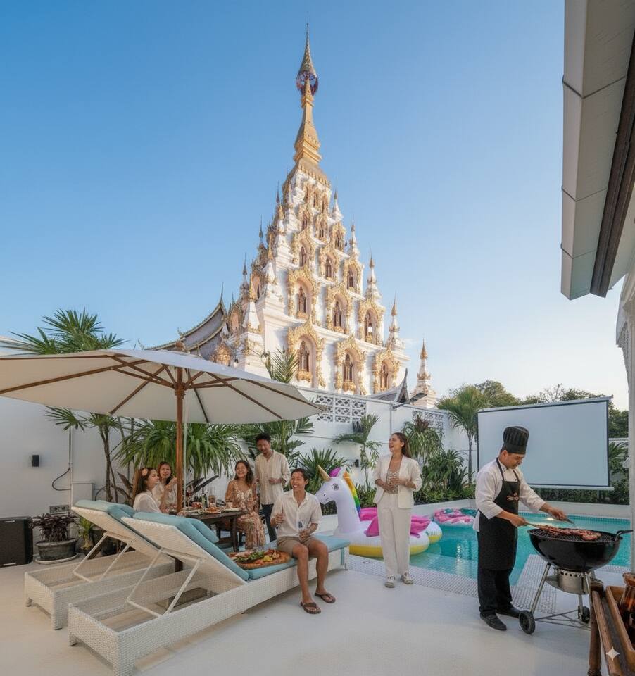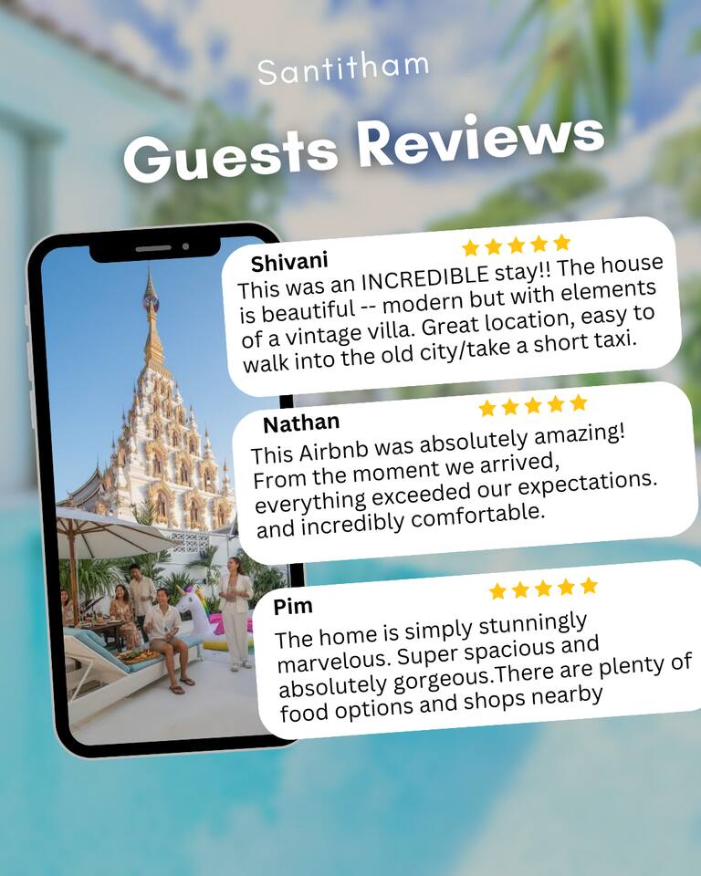 Welcome to SANTITHAM POOL VILLA, part of The CM Villas collection. A stunning 5-bedroom villa with en-suite bathrooms. Enjoy a private pool with breathtaking temple views from its prime location, minutes from Nimman, the Old City, and the airport. Relax in spacious living areas or the fully equipped kitchen. Daily cleaning is included. The villa has beds for 10 guests, with folding beds available for an extra fee to accommodate up to 15..